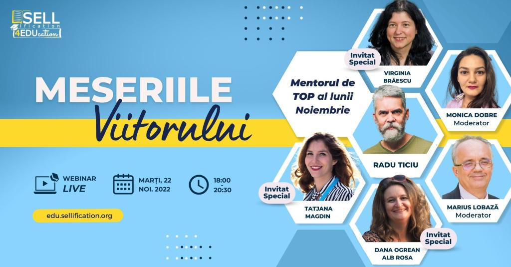 🗓️ Marți, 22 Noiembrie 2022, între orele 18:00-20:30, Asociația SELLification4EDUcation organizează al doilea curs din seria de evenimente lunare Mentorul de TOP, în care abordăm o temă aparte: „Pregătește-ți elevii pentru meseriile viitorului!”, alături de mentorul de TOP al lunii Noiembrie, Radu Ticiu, și invitații speciali: Dana Ogrean Alb Rosa, Tatjana Magdin și Virginia Brăescu.