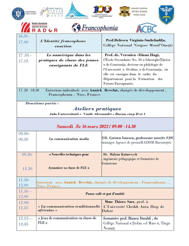 Ultimele două zile, 15 și 16 martie 2024, au fost cu super energie, stare de bine, creativitate, conexiune, structură și multă interacțiune în comunicare în cadrul lucrărilor conferinței în plen și a atelierelor practice susținute la Universitatea „Vasile Alecsandri” din Bacău de formatorii de la #Francophonia Nice (M. Yann Librati, directeur #Francophonia Nice, Prof. univ. Halyna Kutasevych, ingénieur pedagogique et formatrice de formateurs #Francophonia Nice, Mme Annick Miara Revelat, chargée de développement Francophonia Nice), Prof.conf.dr. Amălancei Brândușa-Mariana, doyenne de la Faculté de Lettre, Université „Vasile Alecsandri” Bacău, Dr. Carmen Ionescu, manager Agence de presse RADOR București, Prof.dr. Veronica-Diana Hagi, docteur en philologie de l’Université Ovidius de Constanța, le Département pour la Formation des Futurs Enseignants, Mme Thioro Sarr, professeur à l’Université Cheikh Anta Diop de Dakar, formatrice prof. Bianca Darabă, Colegiul Național „Ștefan cel Mare” Târgu Neamț.