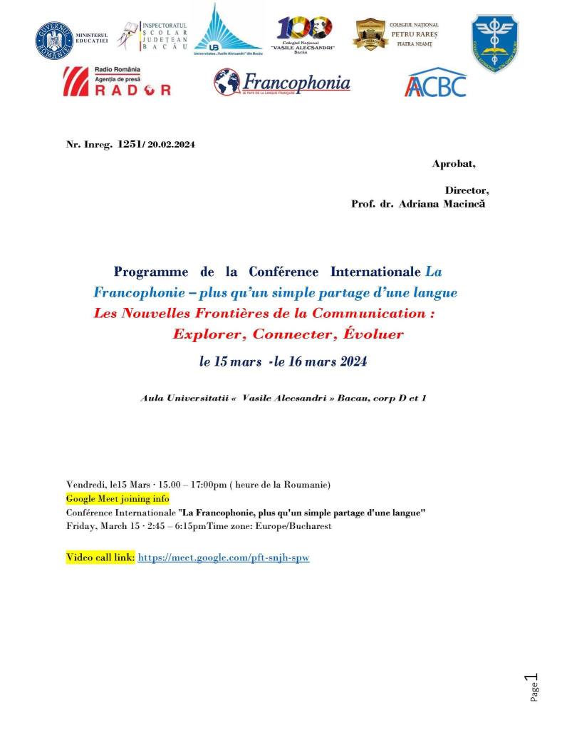 Mulțumesc, dragă Sonia Dumitrascu, prof.dr. Dumitrascu Elena-Sofica la Colegiul Național „Vasile Alecsandri” Bacău, ție și colegelor noastre din echipa de organizare, prof. Georgeta Marinescu, director adjunct la Colegiul Național „Vasile Alecsandri”, prof. Angela Sterpu, președinte ACBC – Asociația Accentul Circumflex Bacău, prof. Daniela Anghel de la Colegiul Economic „Ion Ghica” Bacău, pentru invitația de a fi speaker (cu o comunicare intitulată „L’identité francophone en action„) în cadrul conferinței internaționale cu tema „La Francophonie, plus qu’un simple partage d’une langue – Les Nouvelles Frontières de la Communication: Explorer, Connecter, Évoluer”.