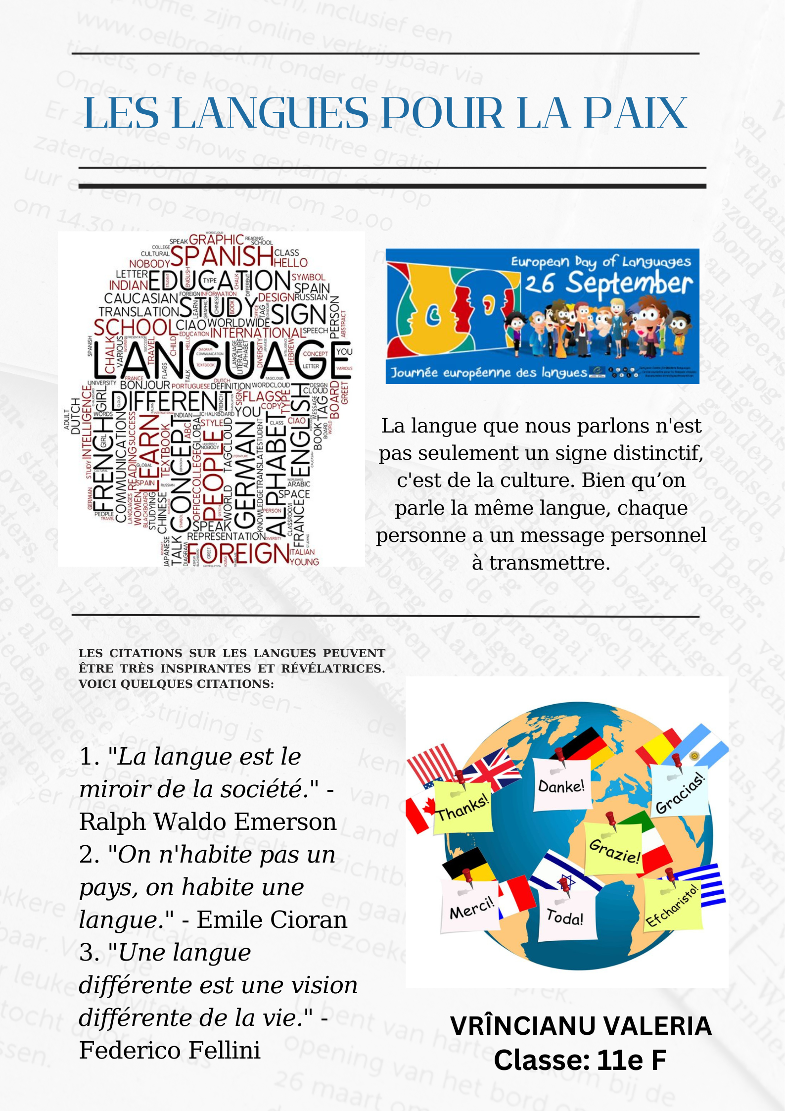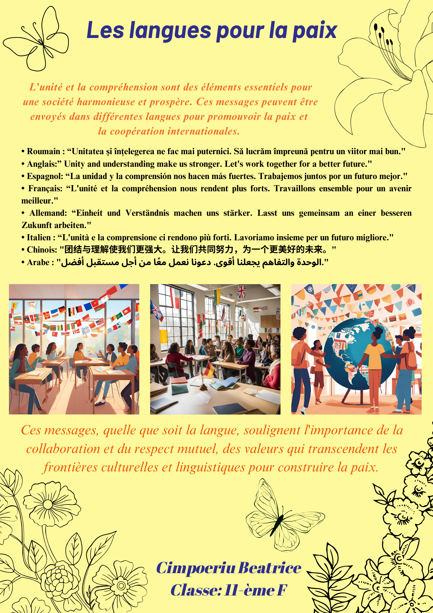 Avec mes élèves de lycée, nous avons activement célébré cette journée, rejoignant l’initiative européenne à travers la création d’affiches et de messages sur l’importance de l’apprentissage des langues étrangères pour promouvoir la paix par la diversité linguistique. Notre projet FR@MITIE a non seulement permis aux élèves de réfléchir sur l’importance des langues, mais aussi de s’engager dans un dialogue plus large autour de la paix et de la coopération mondiale. Par cette activité créative, mes élèves ont pu prendre conscience que chaque langue apprise est une porte ouverte vers une meilleure compréhension de l’autre, contribuant ainsi à l’harmonie entre les peuples.
