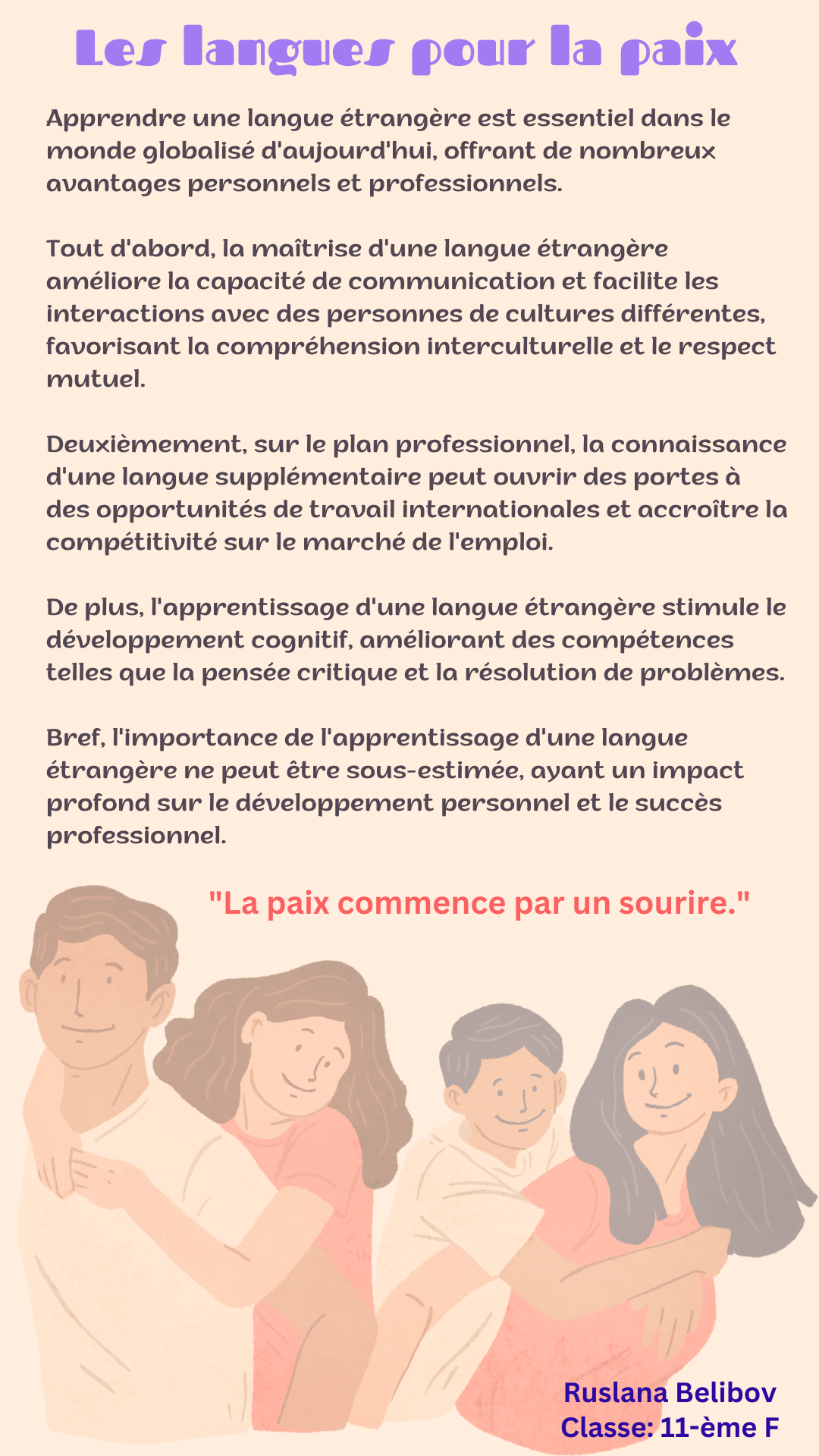 En bref, dans le contexte de la Journée Européenne des Langues 2024, il est important de se rappeler que l’apprentissage des langues, au-delà des bénéfices personnels, joue un rôle clé dans la construction de la paix mondiale. Les langues sont des vecteurs de dialogue, de compréhension et de solidarité internationale, et il est essentiel de continuer à les promouvoir pour bâtir un avenir où la paix est au cœur de nos relations humaines.