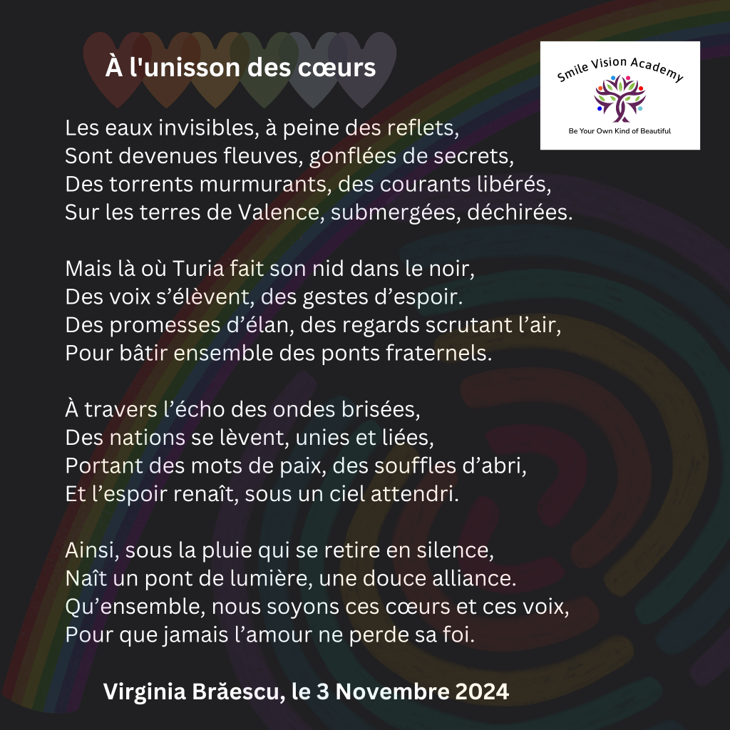 Publicat în Poésies, Smile Vision Academy, Zâmbetul À l’unisson des cœurs Imagine• Publicat de 3 nov. 2024 de Virginia Braescu Partajează asta: Dă clic pentru a partaja pe X(Se deschide într-o fereastră nouă) X Dă clic pentru a partaja pe Facebook(Se deschide într-o fereastră nouă) Facebook Apreciază Încarc... Similare Autor: Virginia Braescu Teacher, Trainer, Speaker, Project manager, Business Owner Vezi toate articolele