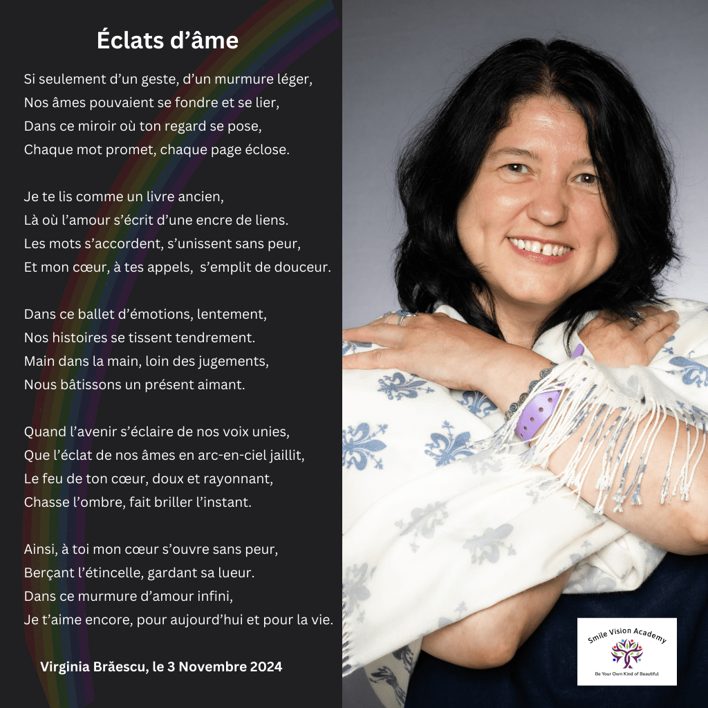 Publicat în Poésies, Smile Vision Academy Éclats d’âme Imagine• Publicat de 3 nov. 202422 nov. 2025 de Virginia Braescu Partajează asta: Dă clic pentru a partaja pe X(Se deschide într-o fereastră nouă) X Dă clic pentru a partaja pe Facebook(Se deschide într-o fereastră nouă) Facebook Apreciază Încarc... Similare Autor: Virginia Braescu Teacher, Trainer, Speaker, Project manager, Business Owner Vezi toate articolele