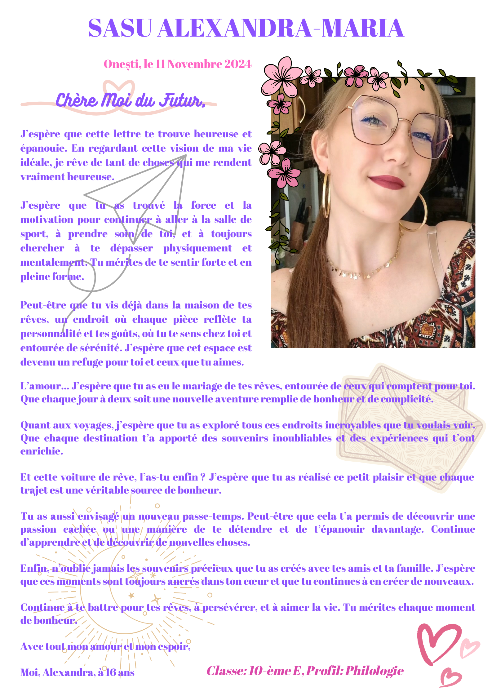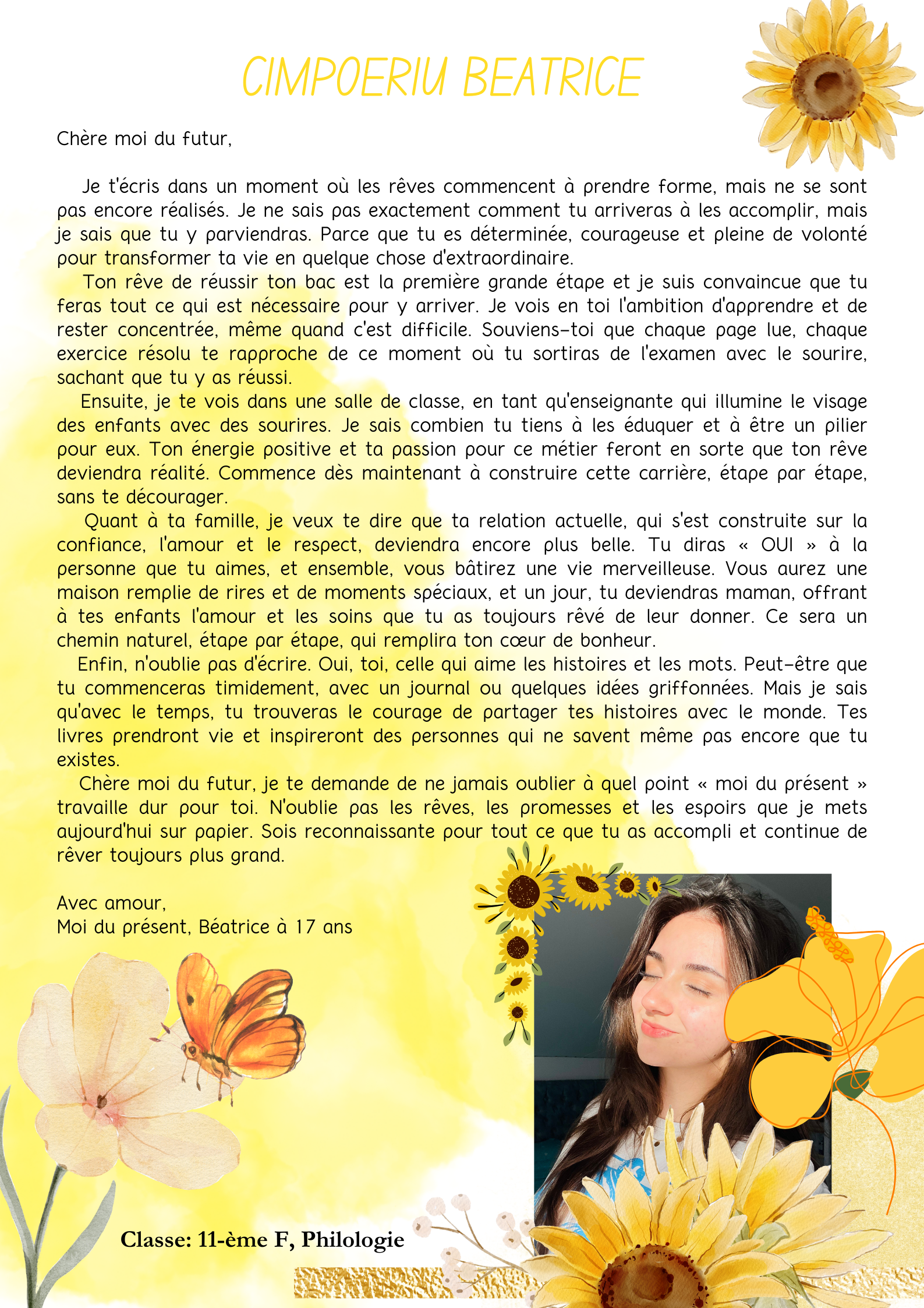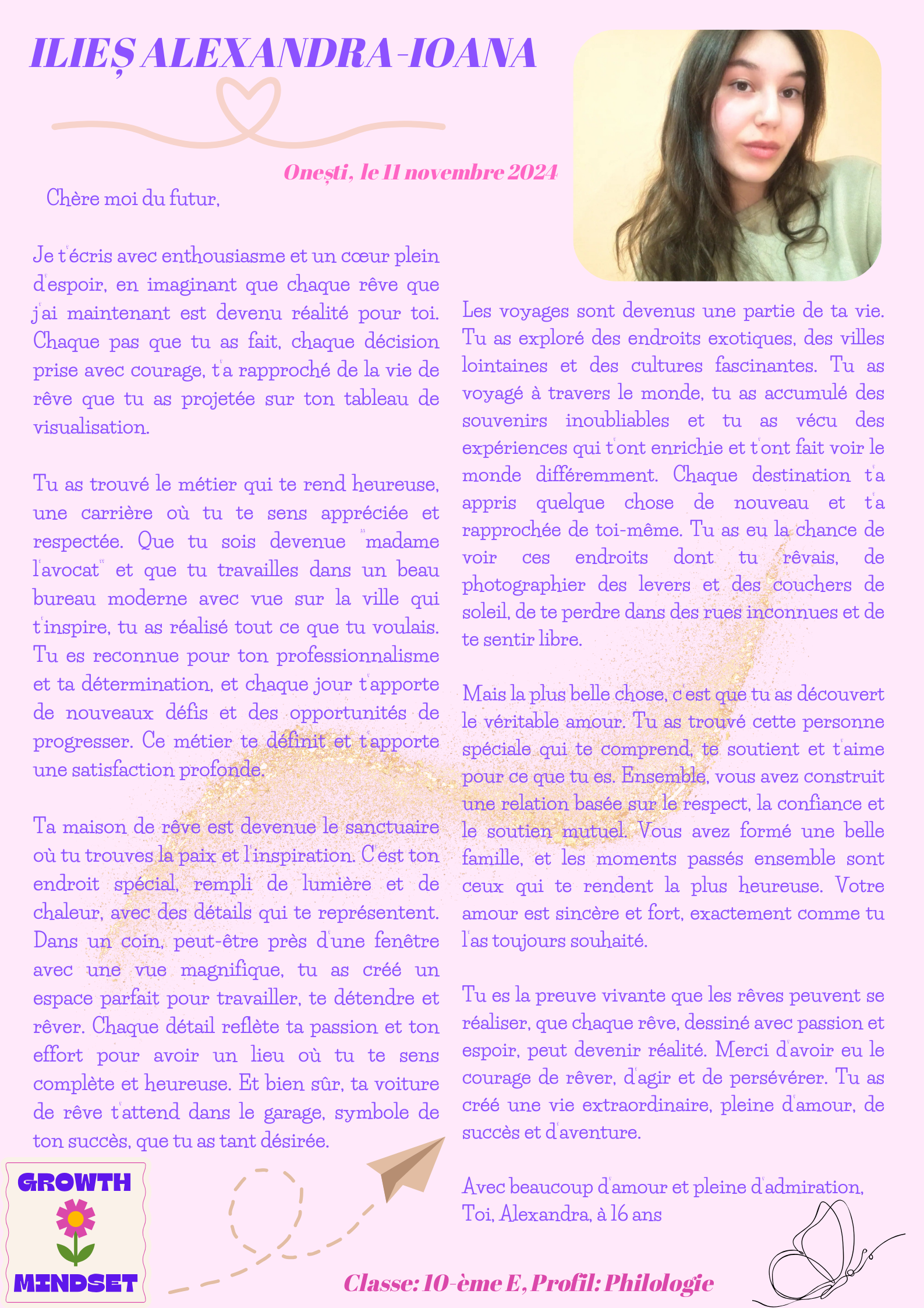 Realizarea unei introspecții personale și transmiterea, printr-o scrisoare, a reflecțiilor, speranțelor, aspirațiilor și visurilor către sinele viitor, dezvoltând creativitatea și gândirea critică.