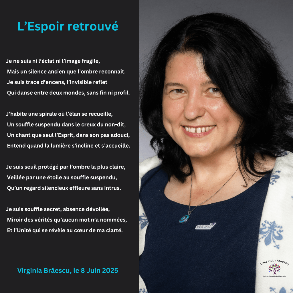 Publicat în Moi, réinventée, Poésies, Sagesse, Spiritualitate Sagesse Imagine• Publicat de 8 iun. 202510 iun. 2025 de Virginia Braescu Partajează asta: Dă clic pentru a partaja pe X(Se deschide într-o fereastră nouă) X Dă clic pentru a partaja pe Facebook(Se deschide într-o fereastră nouă) Facebook Apreciază Încarc... Similare Autor: Virginia Braescu Teacher, Trainer, Speaker, Project manager, Business Owner Vezi toate articolele