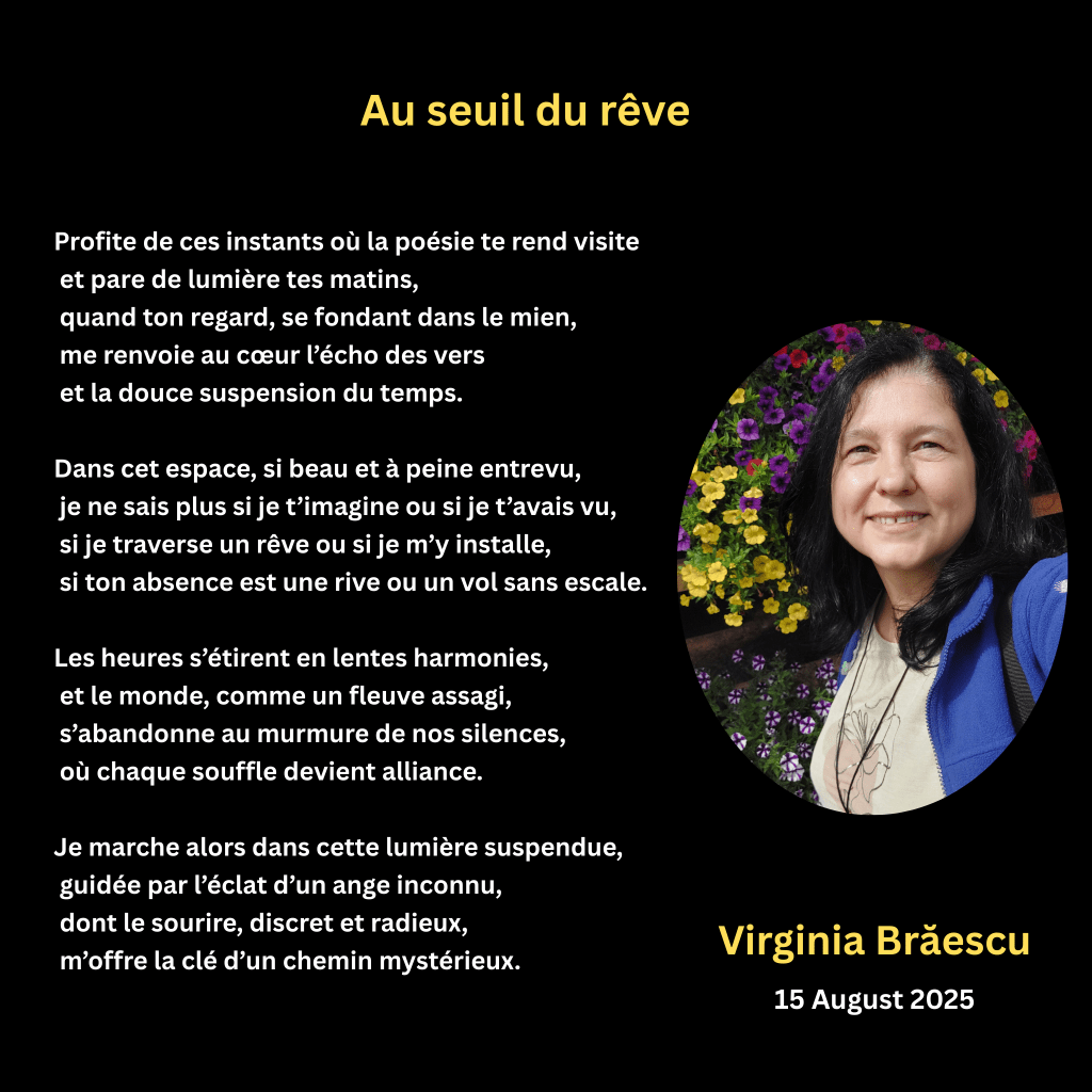 Publicat în Mediatorul cărții, Poésies, Smile Vision Academy Au seuil du rêve Imagine• Publicat de 17 aug. 2025 de Virginia Braescu Partajează asta: Dă clic pentru a partaja pe X(Se deschide într-o fereastră nouă) X Dă clic pentru a partaja pe Facebook(Se deschide într-o fereastră nouă) Facebook Apreciază Încarc... Similare Autor: Virginia Braescu Teacher, Trainer, Speaker, Project manager, Business Owner Vezi toate articolele