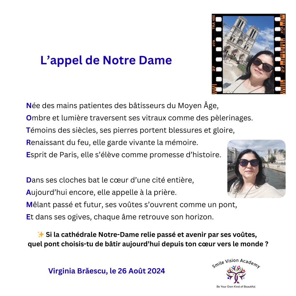 Publicat în Ecriture créative, Francophonia, Poésies, Smile Vision Academy, Tradiție și Inovație în Educație L’Appel de Notre-Dame Imagine• Publicat de 26 aug. 2025 de Virginia Braescu Partajează asta: Dă clic pentru a partaja pe X(Se deschide într-o fereastră nouă) X Dă clic pentru a partaja pe Facebook(Se deschide într-o fereastră nouă) Facebook Apreciază Încarc... Similare Autor: Virginia Braescu Teacher, Trainer, Speaker, Project manager, Business Owner Vezi toate articolele