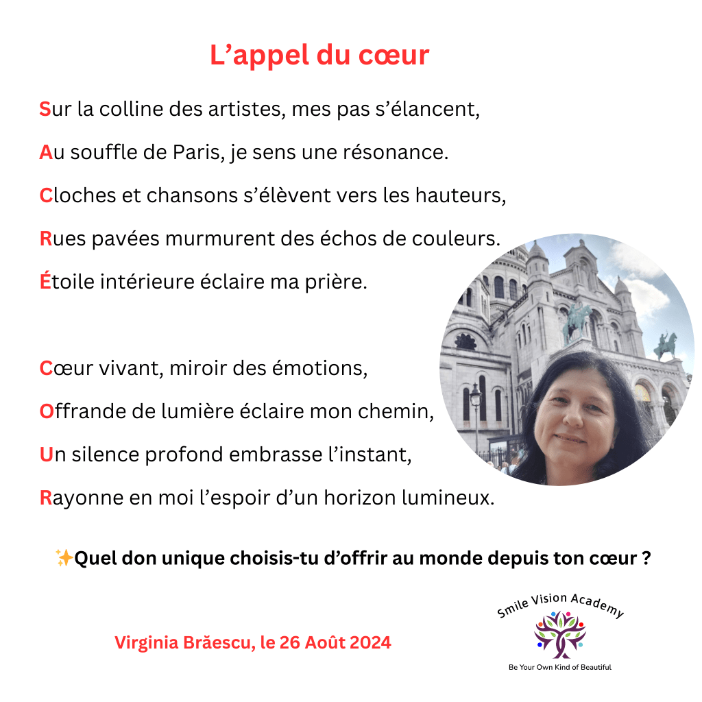Publicat în Ecriture créative, Poésies, Smile Vision Academy L’appel du coeur Imagine• Publicat de 26 aug. 202522 nov. 2025 de Virginia Braescu Partajează asta: Dă clic pentru a partaja pe X(Se deschide într-o fereastră nouă) X Dă clic pentru a partaja pe Facebook(Se deschide într-o fereastră nouă) Facebook Apreciază Încarc... Similare Autor: Virginia Braescu Teacher, Trainer, Speaker, Project manager, Business Owner Vezi toate articolele