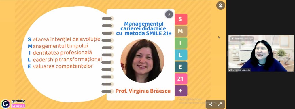 Acum 14 ani, mi-am scris Visul pe hârtie: SMILE21+ (Strategii de Mediere/Management/Mentorat pentru Inovație și Leadership în Educație). Acest Vis mi-a fost inspirat de elevii mei care apreciază că le zâmbesc și am răbdare să-i ascult. Doresc, prin acest VIS, să mă bucur în continuare de viață și creșterea mea, să fiu creativă și inovativă, să aduc bucurie, creștere și plus valoare în jurul meu, contribuind la creșterea celorlalți prin cursurile și proiectele pe care le dezvolt.